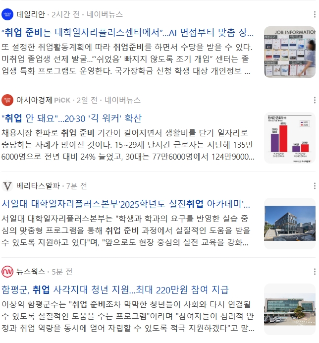요즘 뉴스를 보면, 예전과 달리 대학 안에 있는 일자리센터에서는 인공지능으로 면접을 연습하게 해주거나, 학생 개개인 상황에 맞춰 상담을 해주는 등 훨씬 세밀하게 도와주고 있어요.