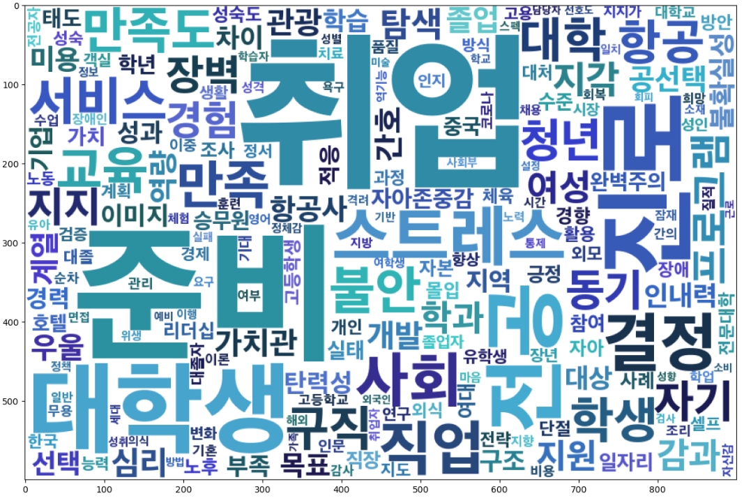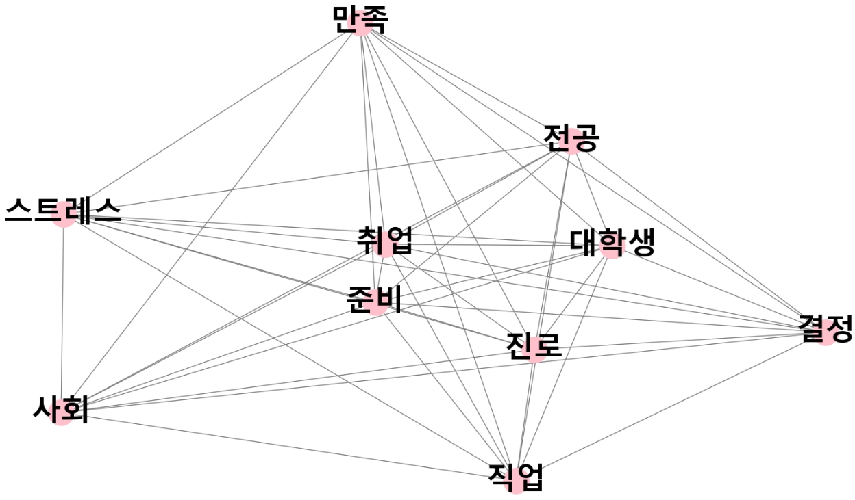 워드클라우드에서 확인했던 것과 동일하게 "취업", "준비", 진로”, "결정", "대학생" 과 같은 핵심 단어들이 중심에 위치하면서 다른 단어들과 긴밀하게 연결된 모습을 확인할 수 있습니다. 또한 "스트레스", "사회", "전공", "만족", "직업" 등의 단어 역시 취업준비와 밀접하게 연관되어 있음을 보여주고 있습니다.